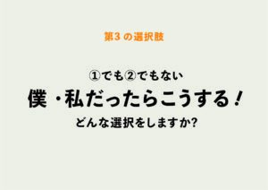 そして、最後に「①でも②でもない、自分ならどうするか?」を考えます。